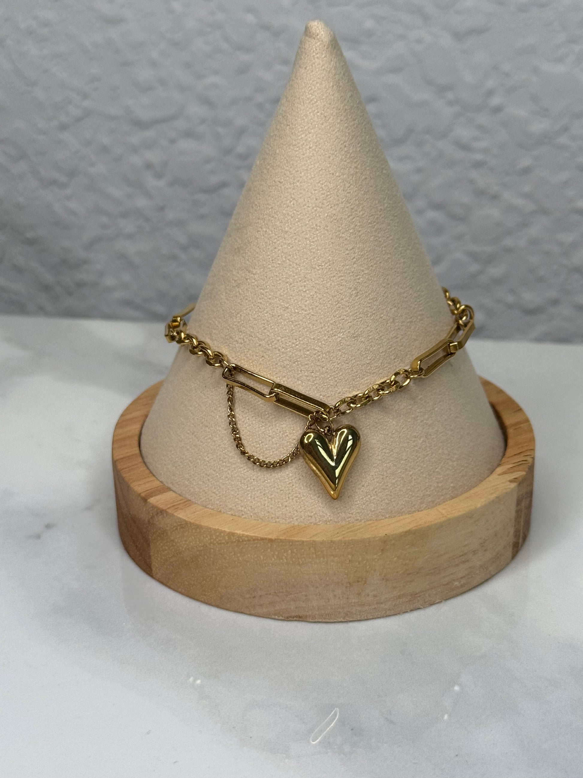 18k gold plated stainless steel bracelet with cable and clip chain and a gold heart charm with a dangling small chain.