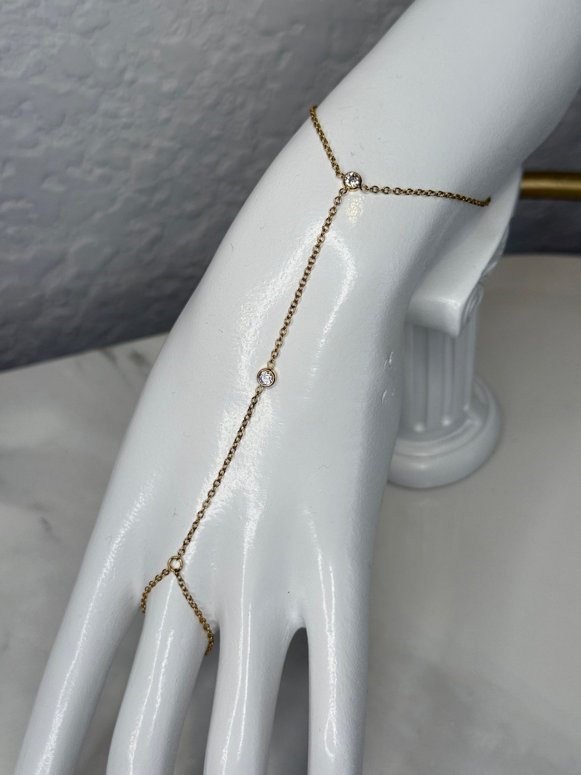 This elegant 18k gold-plated hand chain is made with durable stainless steel and accented with two sparkling zircons. Its beautiful, simple design is perfect for everyday wear.