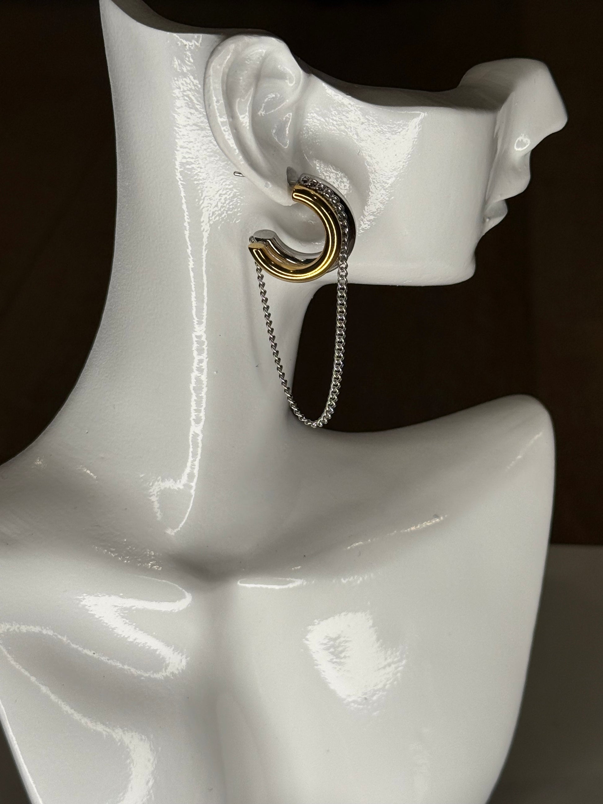 Elevate your everyday style with these modern and versatile earrings. Crafted from durable, 18k gold-plated stainless steel, they feature interconnected double hoops that offer a chic and dynamic look. A delicate chain drop adds a touch of movement and flair, taking them effortlessly from a day at the office to a night out. Choose from a sophisticated two-tone design with a striking contrast, or an elegant all-gold finish to match your unique style.