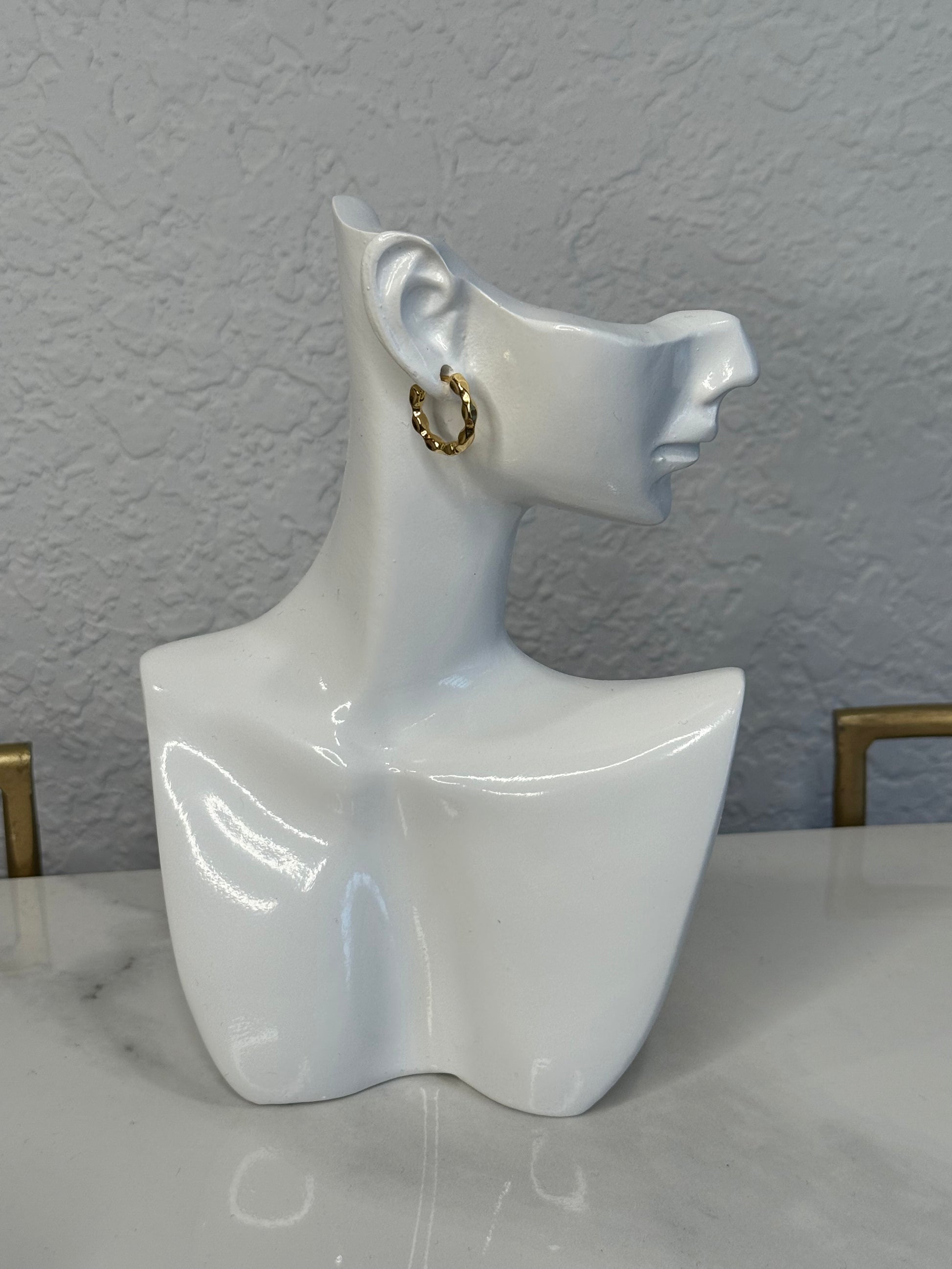 These small hoops are a fresh take on a classic. Featuring a unique, sculptural design, they add an artistic and modern touch to any outfit. Crafted from durable, 18k gold-plated stainless steel, these non-tarnish earrings are built for everyday wear and a perfect fit. The dainty size (15mm H x 17mm W) makes them a versatile staple for any jewelry collection.